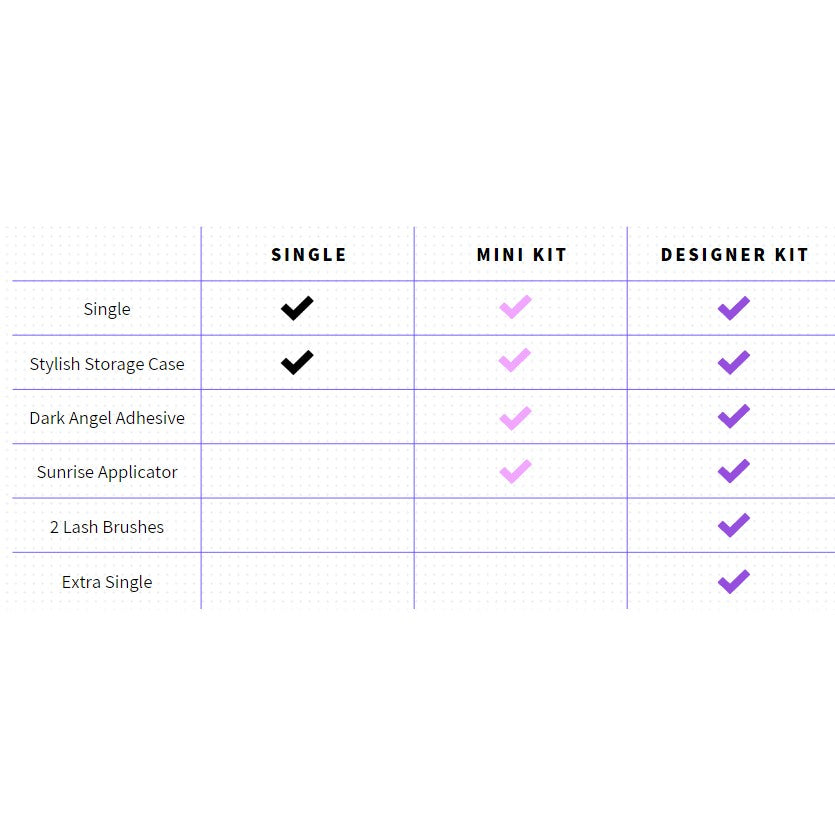 Upgrade your lash game with a lash set, Dark Angel Adhesive, and Sunrise Applicator for easy application.
